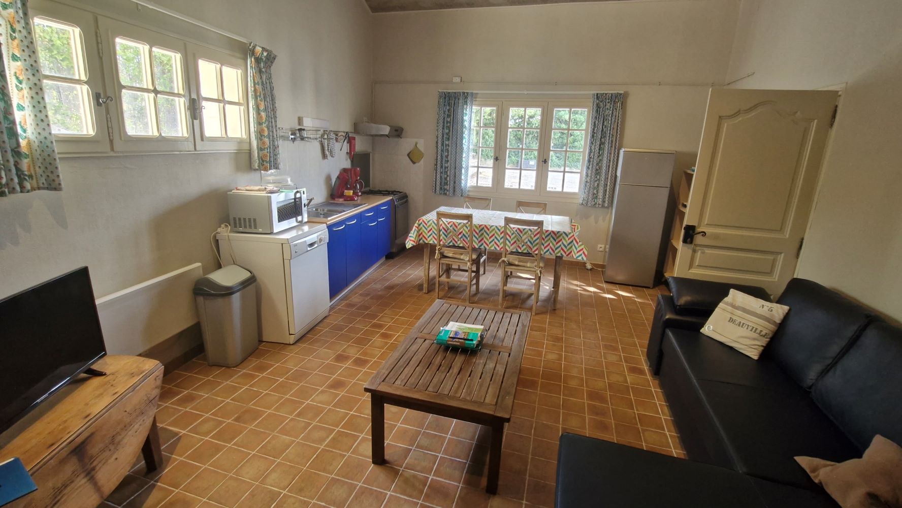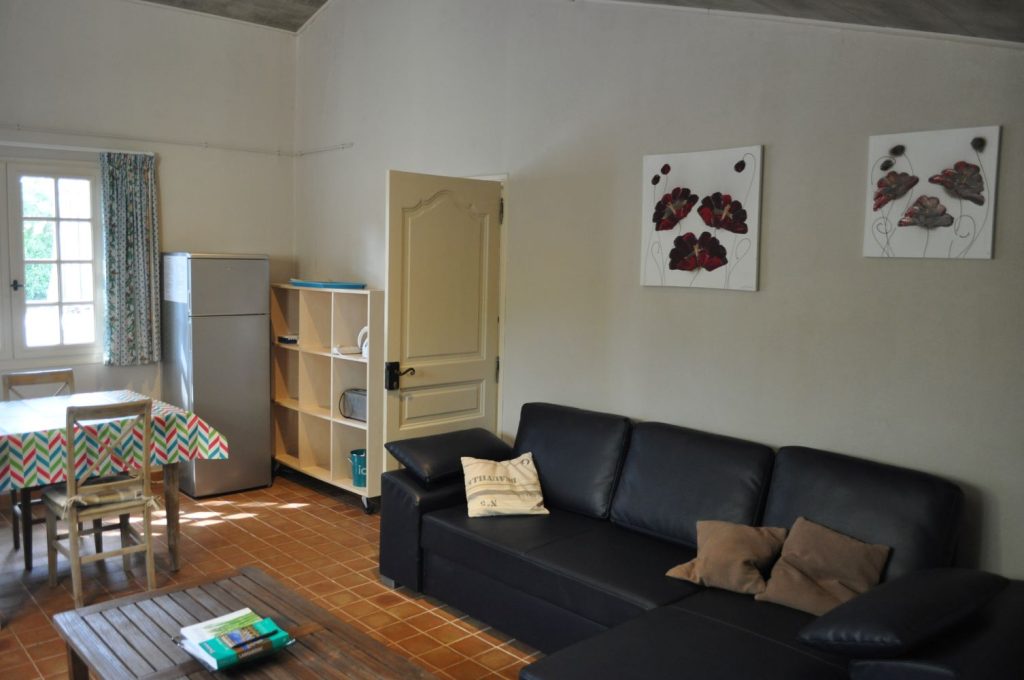This detached gite for up to 4 people has an open-plan living area with a fully equipped kitchen, dining area and lounge with sofa bed, a bedroom with double bed, and a bathroom with shower and toilet, as well as a lovely shaded terrace with garden furniture.